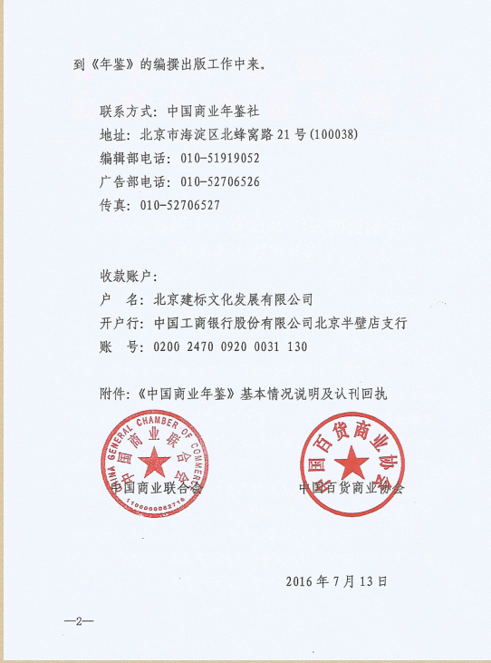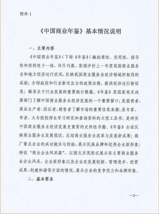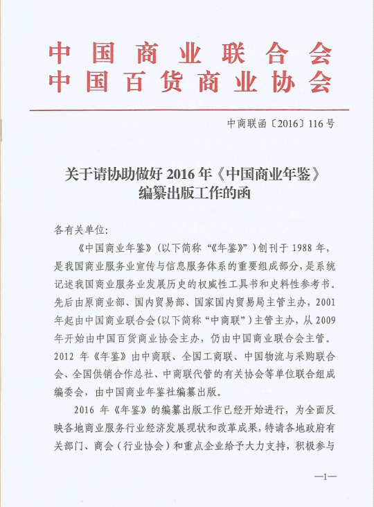 中商联关于编纂2016年《中国商业年鉴》的函