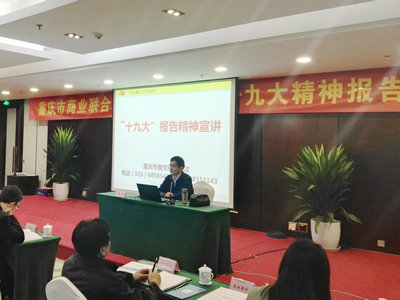 党的十九大已于上月胜利闭幕。为引导商贸行业企业认真领会学习宣传十九大精神,11月9日上午,市商联会在统景两江酒店成功举办了学习宣传党的十九大精神报告会。市商联会的副会长、常务理事、理事单位负责人及代表,市商联会、各区县商联会、市商贸行业协会的驻会人员等,共计100余人参加了报告会。